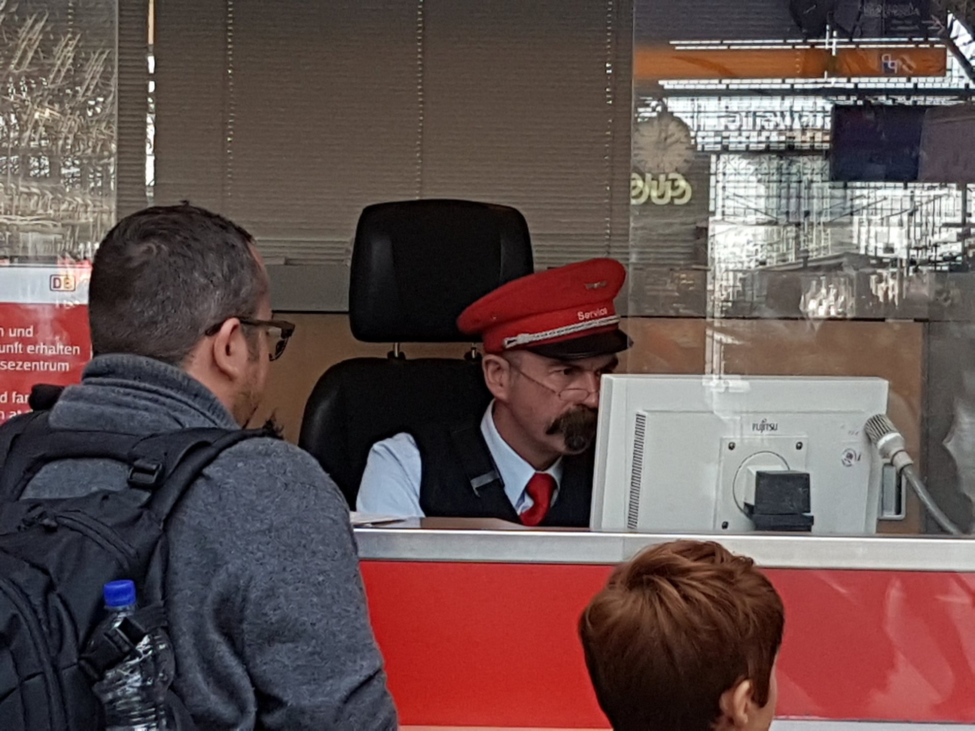 Deutsch Bahn male staff at Customer Service, complete with his hat and mustache.