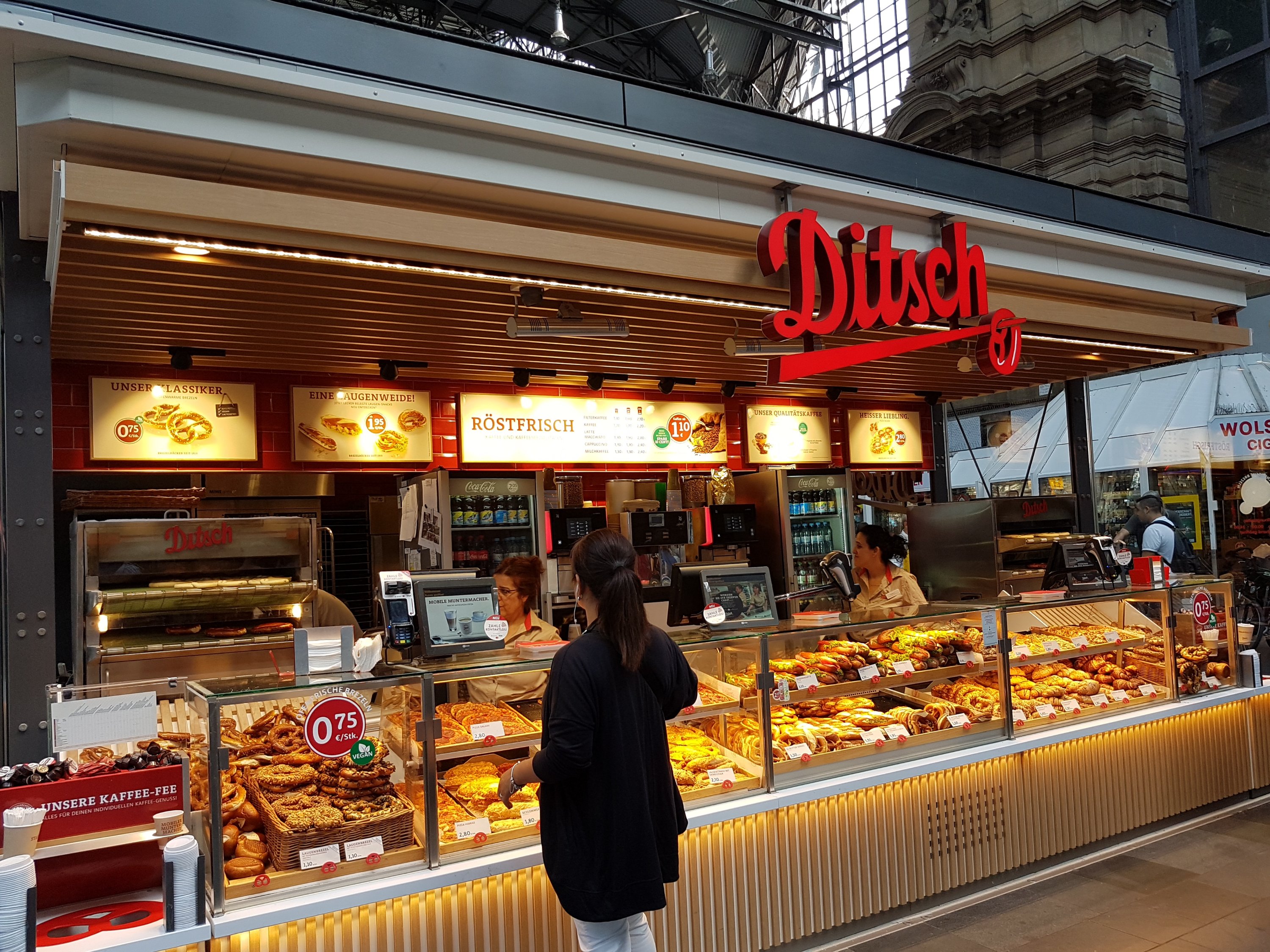 View of platform for the long distance train. Food kiosk selling all kinds of coffee, tea, sandwiches, bakeries, are available at Frankfurt main station