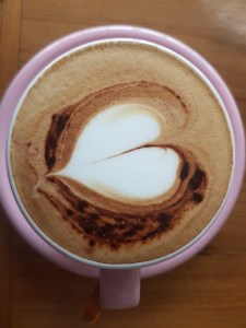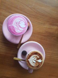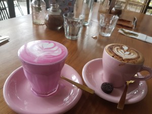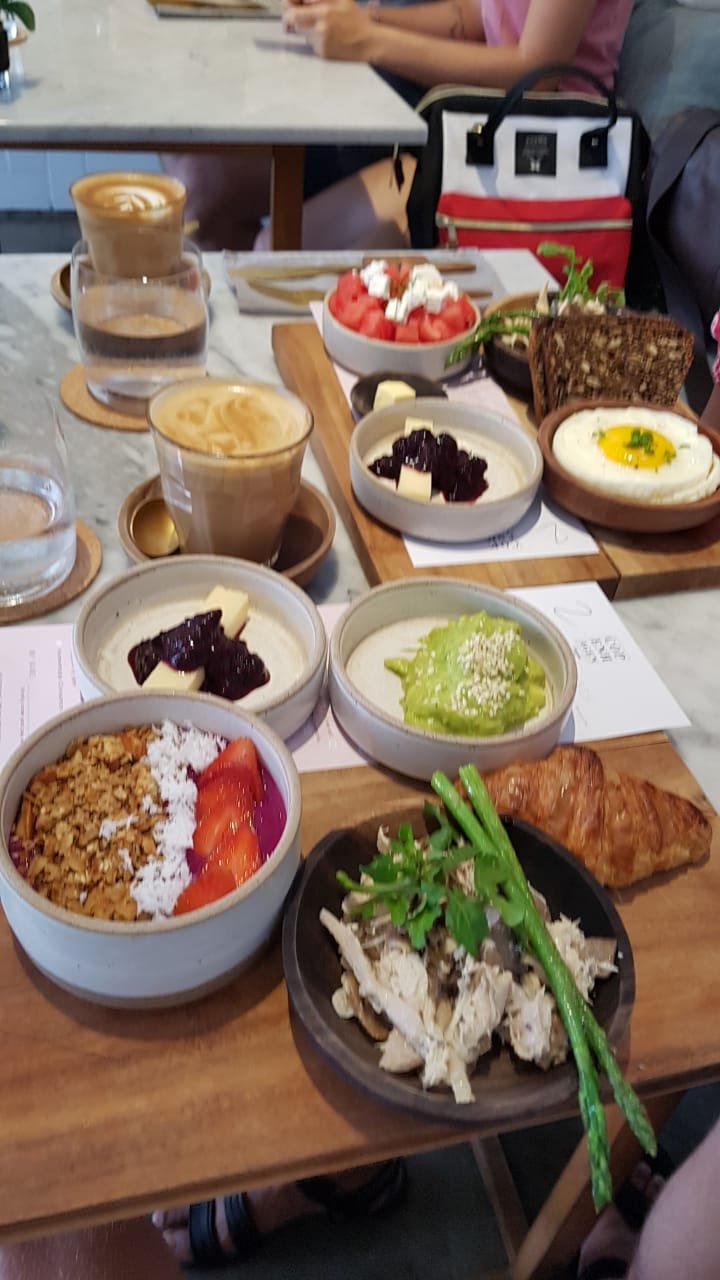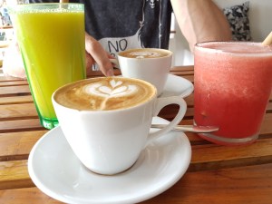 All day brekkie at the Gu. Western breakfast, healthier options available. Pretty colors of the lattes.