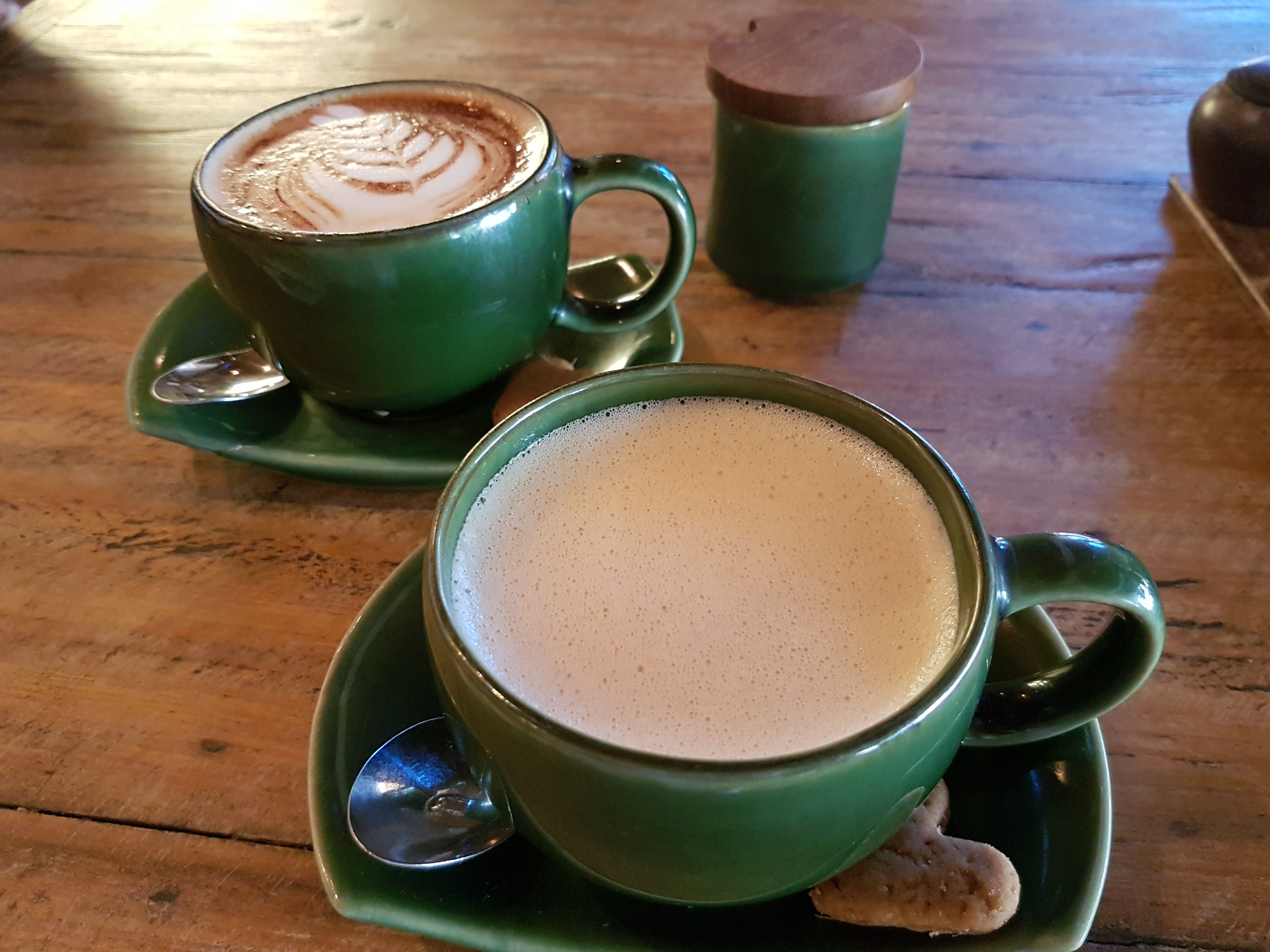 All day brekkie at the Gu. Western breakfast, healthier options available. Pretty colors of the lattes.
