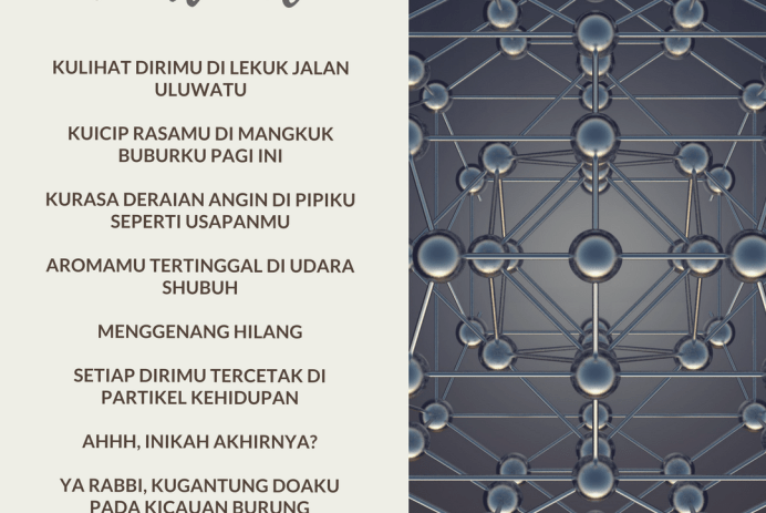 Kulihat dirimu di lekuk jalan Uluwatu Kuicip rasamu di mangkuk buburku pagi ini Kurasa deraian angin di pipiku seperti usapanmu Aromamu tertinggal di udara shubuh Menggenang hilang Setiap dirimu tercetak di partikel kehidupan Ahhh, inikah akhirnya? Ya Rabbi, kugantung doaku pada kicauan burung Semoga satu saat nanti akan sampai pada-Mu